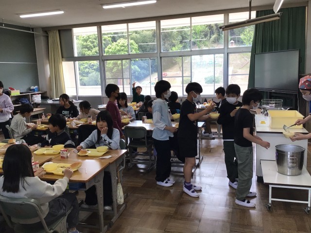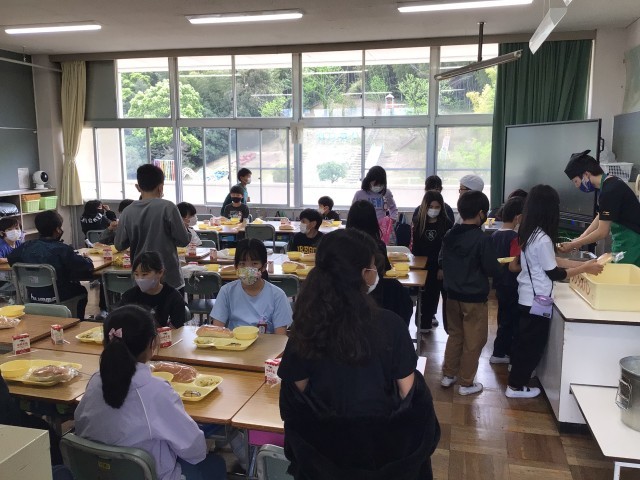 1年生は早めに食べ始めています。準備は5年生でも担任の先生が奮闘しています。