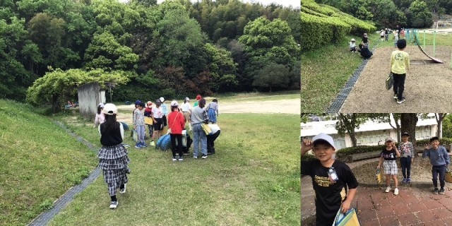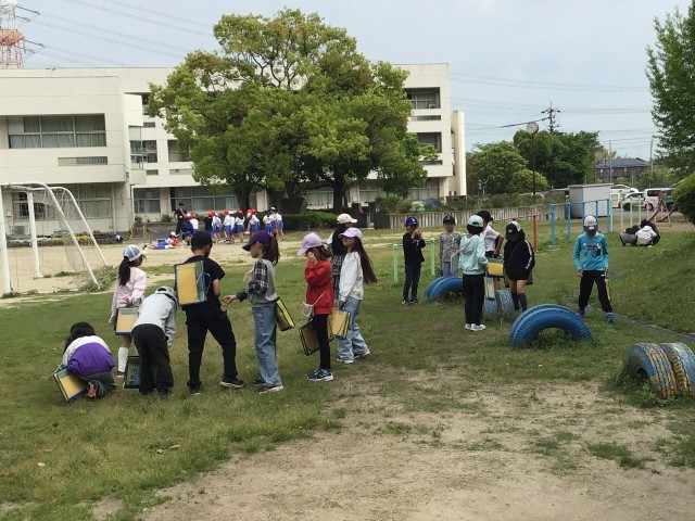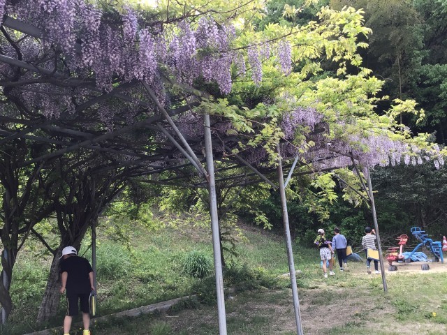 運動場の藤棚がとてもきれいです。春の生き物や花を観察しました。バッタがたくさんいたようです。