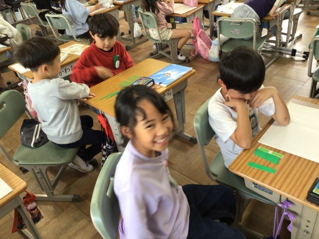数え棒を使いながら、どのようにして考えたかを友達に説明していました。説明することで、自分の理解が深まります。