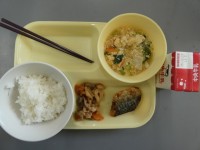 今日のメニューは、鰆のしょう油マヨネーズ焼き、凍り豆腐の卵とじ煮、キャベツの香の物和え等です。
