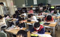 3年生は、初めての習字に取り組んでいます。筆の穂先をきれいにそろえて、緊張した面...