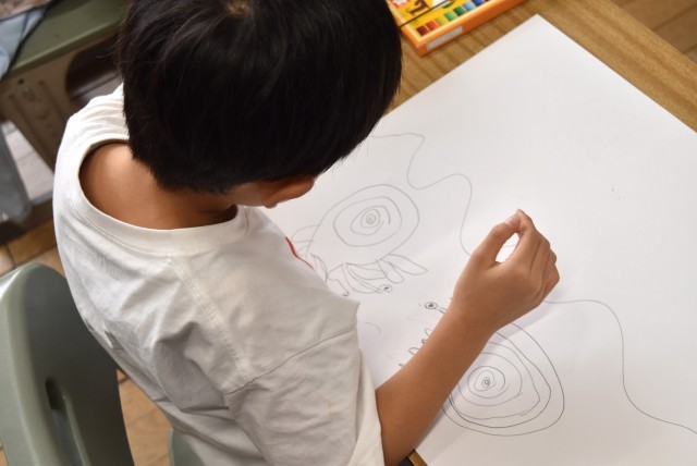 読み聞かせから場面を想像して絵にします。