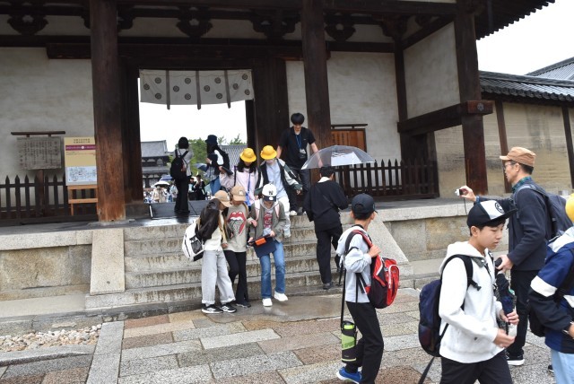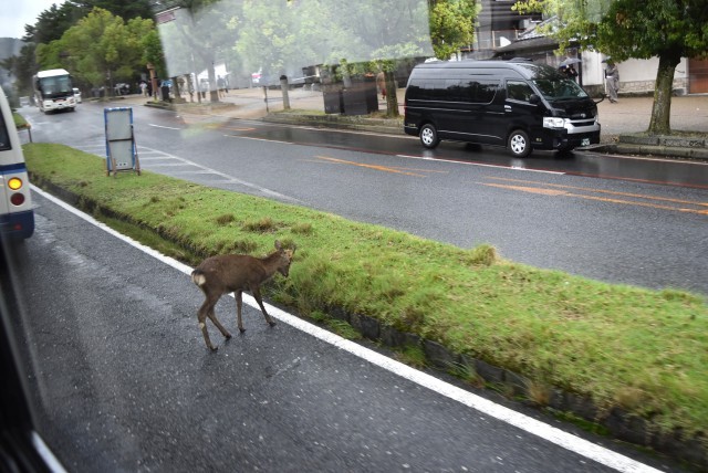 奈良公園へ移動ですが、道路を横断するシカが優先。