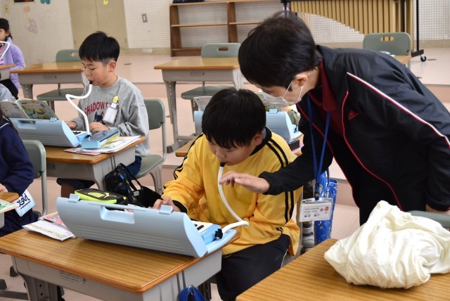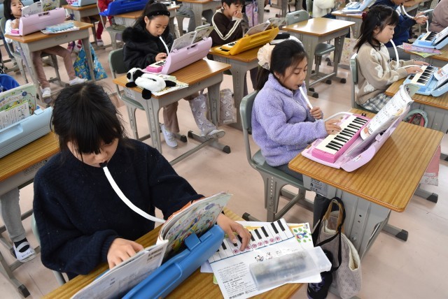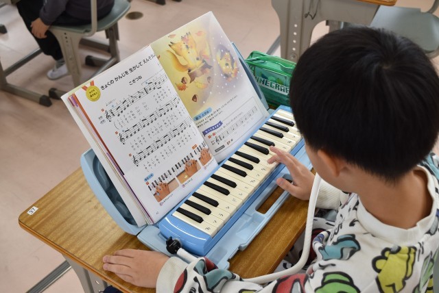 2年生が音楽「こぎつね」で鍵盤ハーモニカの学習。
