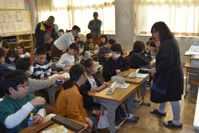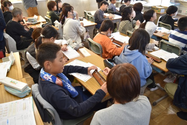 4年生が書写で「生命」を毛筆、算数でそろばんの学習。