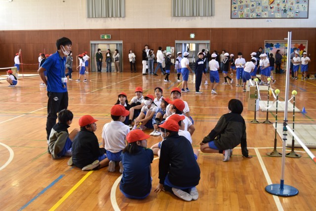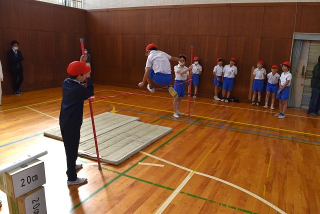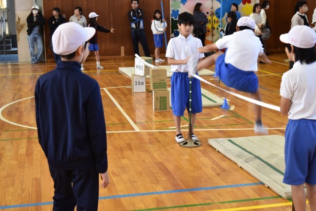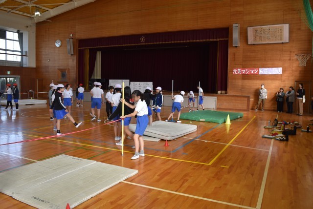 5年生が合同体育で高跳びの学習。