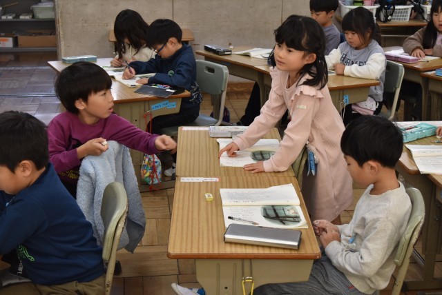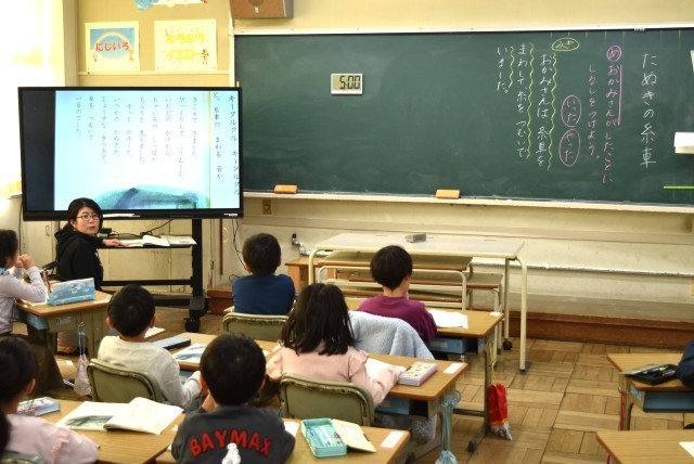 1年生が国語「たぬきの糸車」で読む学習。