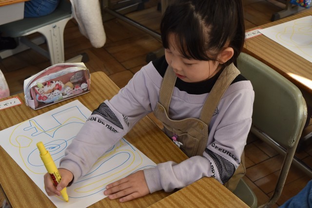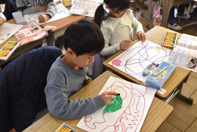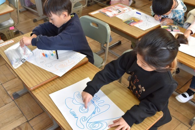 1年生が図工「せんのぼうけん」の制作。