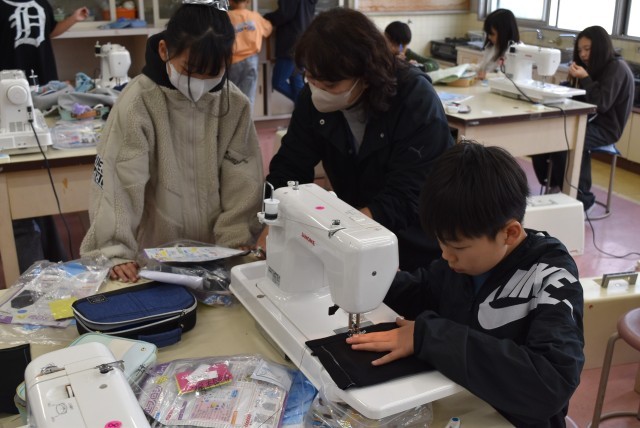 5年生が家庭「ミシンにトライ」でエプロン製作。