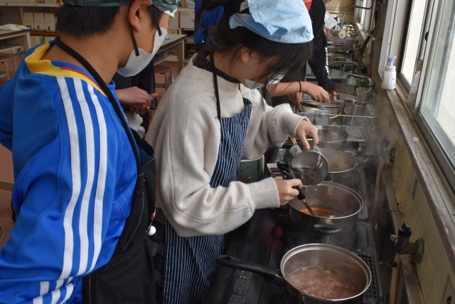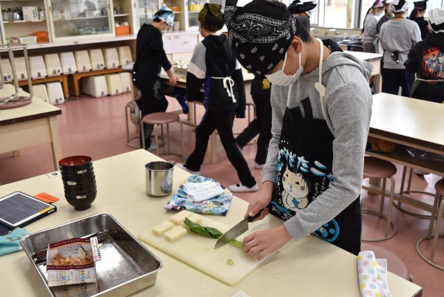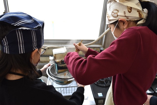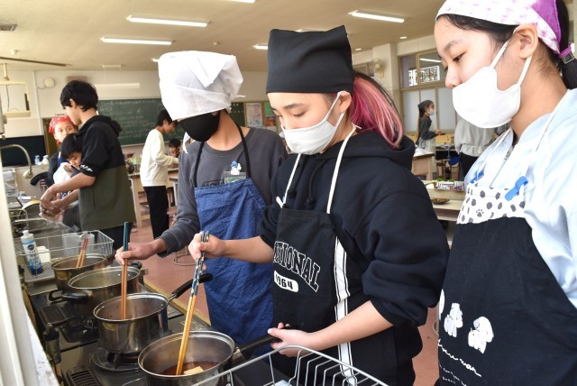 6年生が家庭「出汁の違いを味わおう」で雑煮の調理実習。