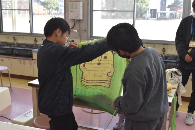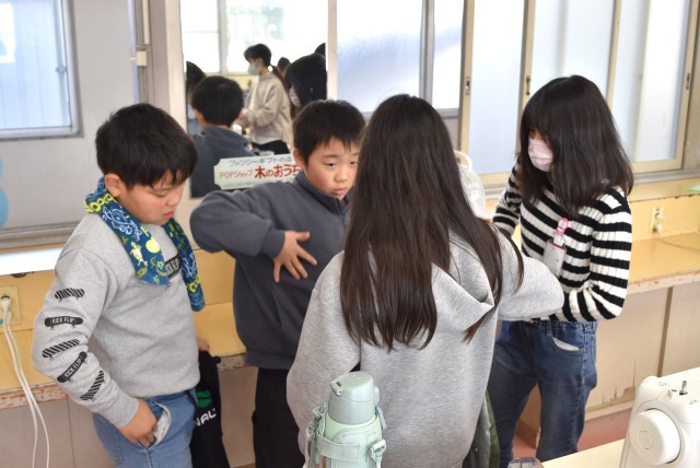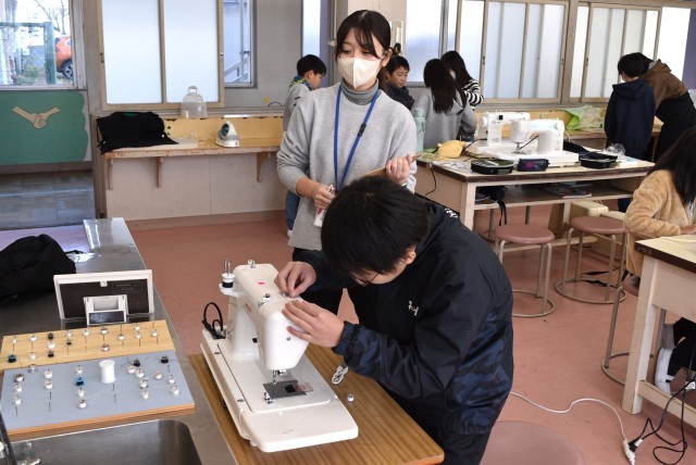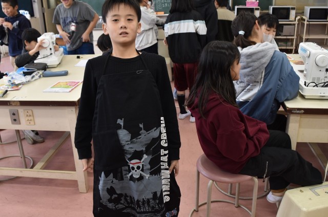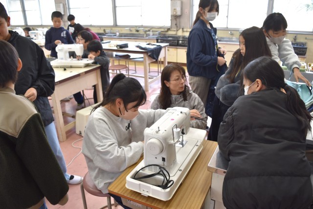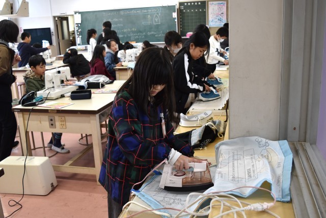5年生が家庭「ミシンにトライ」でエプロン製作。