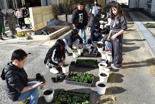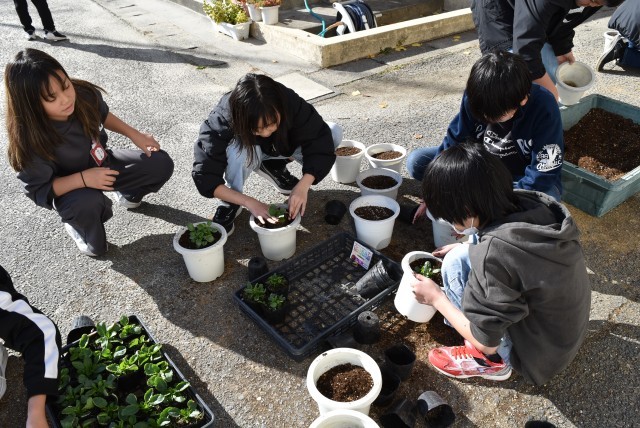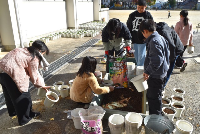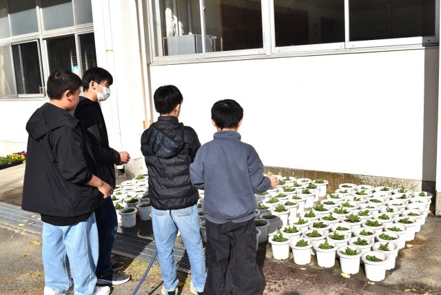 慣れた手つきで卒業式や入学式での花の準備をしています。