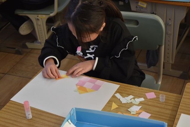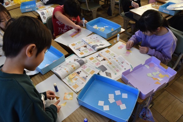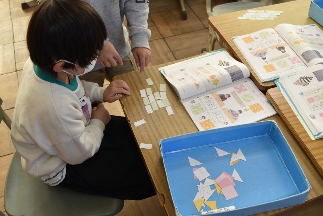 教科書と同じもようを作ったり、形を見立てて並べたりしました。