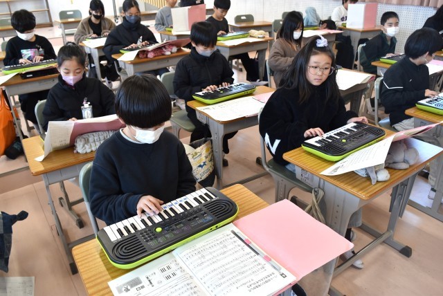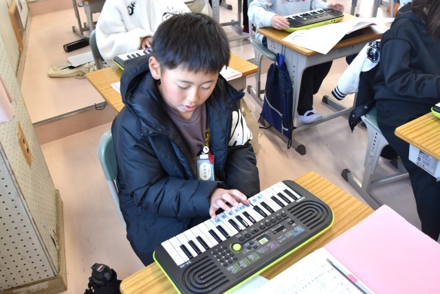 4年生が音楽で「ラ クンパルシータ」をキーボードで演奏。