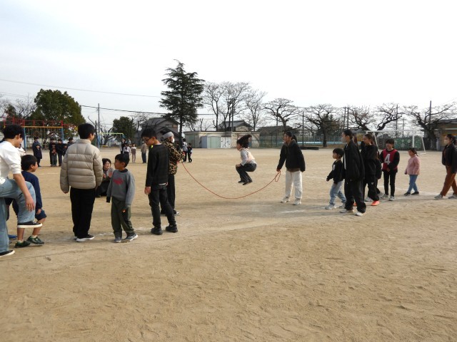ペアの6年生に背中を押してもらって、タイミングよく縄に入る1年生。