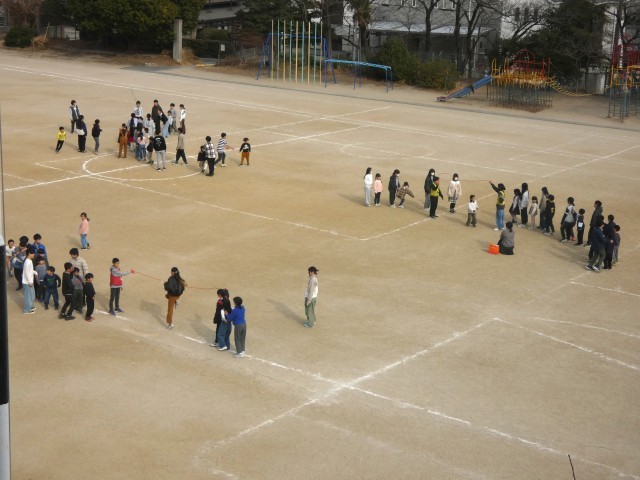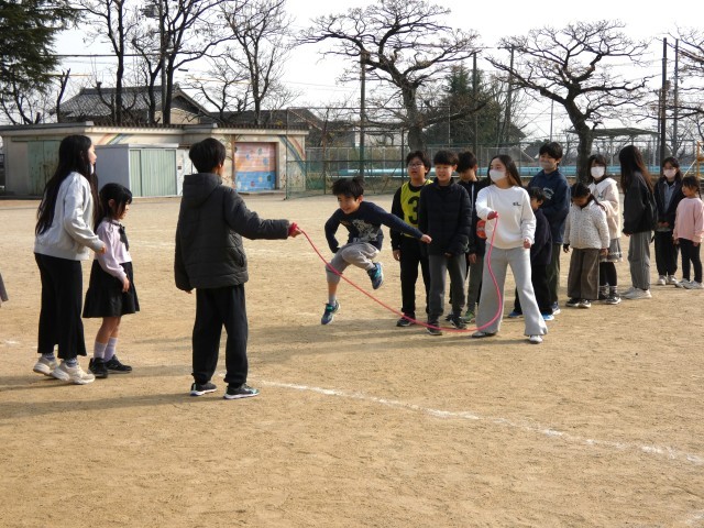 1年生と6年生ペアが一緒に「長縄」の学習。