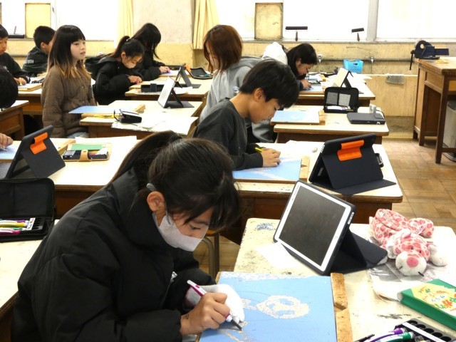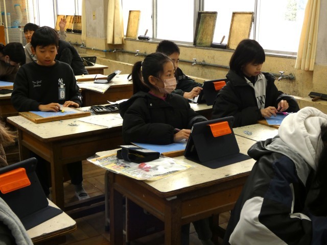 4年生が図工で「ほってすって見つけて」で彫る学習。