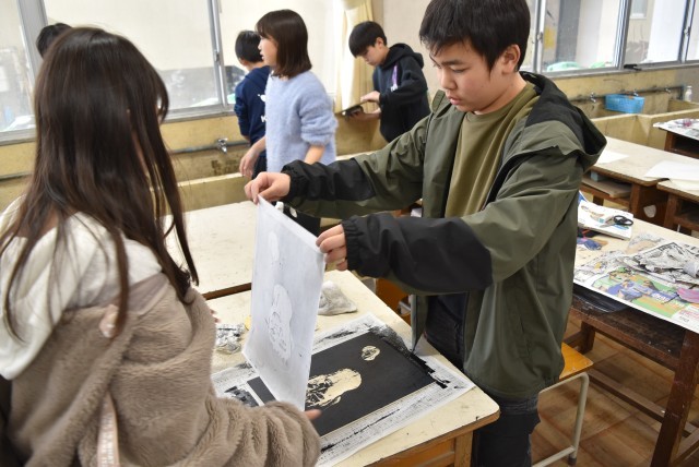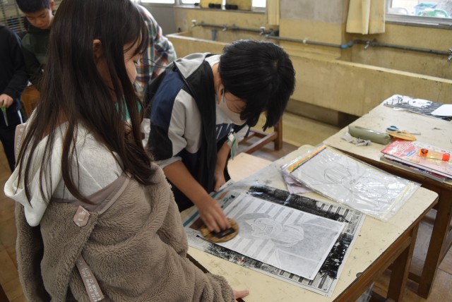 あおぞら学級では図工「自画像」で木版画。