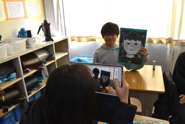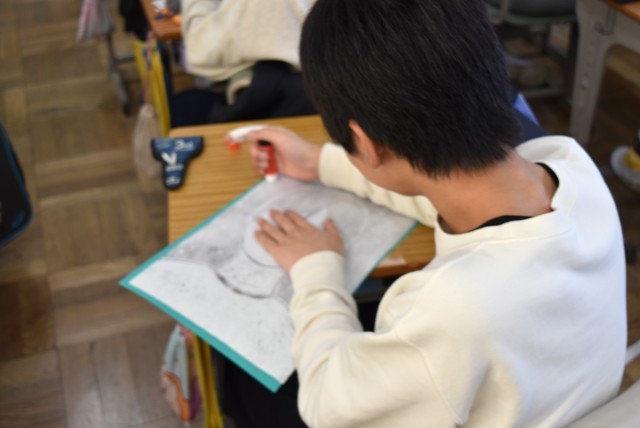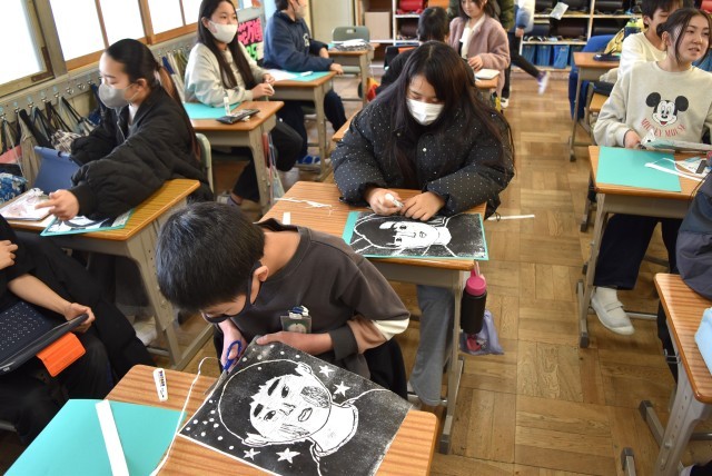 6年生が図工「自画像」で木版画。