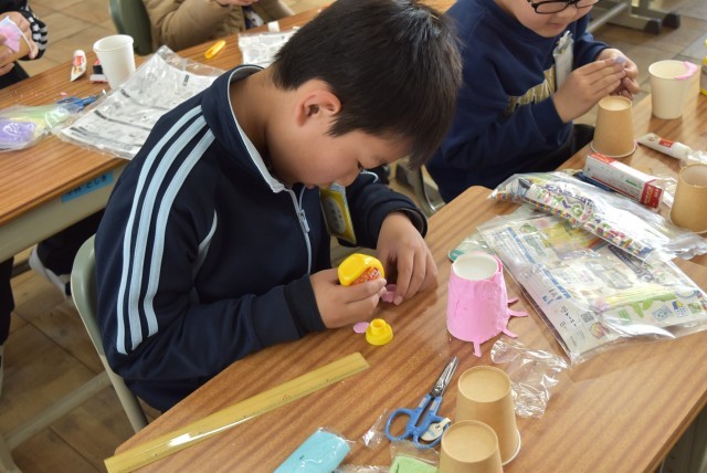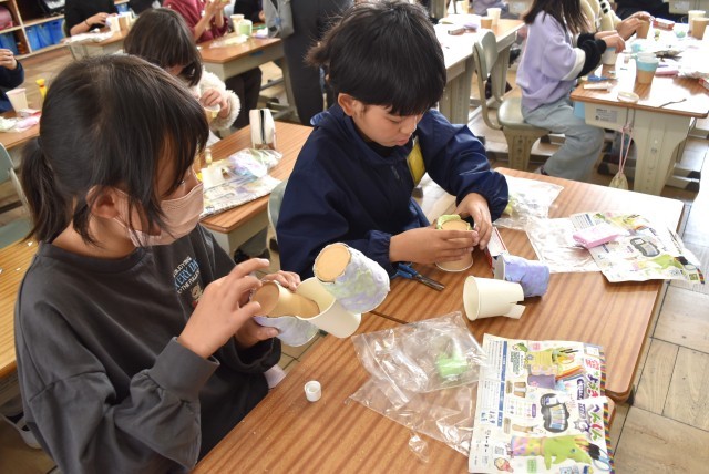 3年生が図工「空き容器のへんしん」の制作。