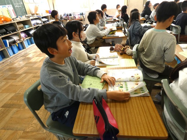 4年生が外国語活動「ぼく・わたしの一日」の学習。