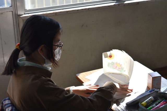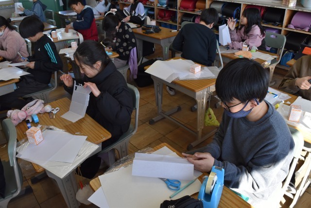 5年生が図工「紙から生まれるすてきな明かり」の制作。