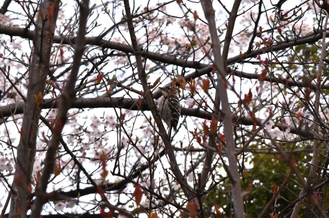 かわいらしいコゲラは桜の蜜を吸うそうですよ。