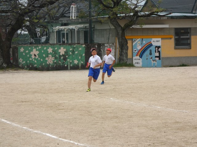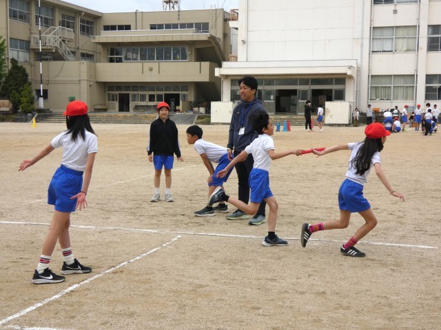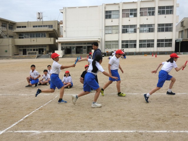 前に走る子のスピードを考えてリードをとり、バトンを受け取ります。