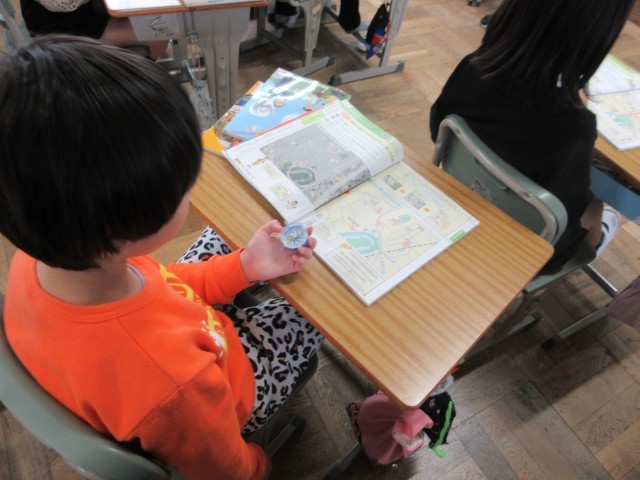 3年生が方位磁石を使って方角の学習をしています。