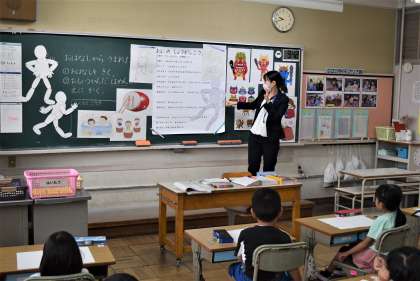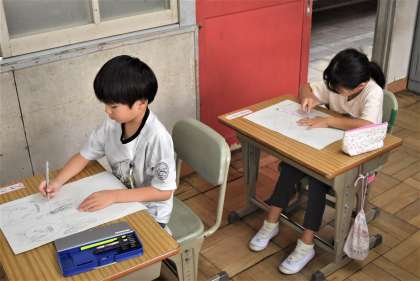 1年生が国語・図工で、ことばから想像したことを絵にします。