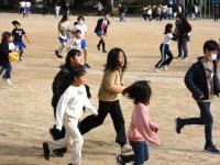 大放課は、ペアと一緒にマラソンの時間。年下のペアを気遣ってゆっくり走る高学年。年...