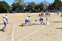 3年生が体育で「三角ベース」の学習。どこに打つとよいか。ときどき守りの隙間をパー...