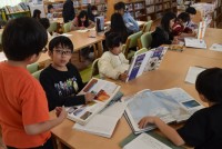 4年生が国語で調べ方の学習。図書館で資料さがしです。タブレットでの検索と図書館で...