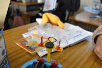 5年生が理科「電流が生み出す力」の学習。コイルをつくり磁石の上にセットしてスイッ...