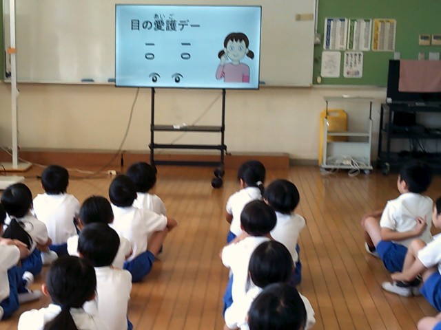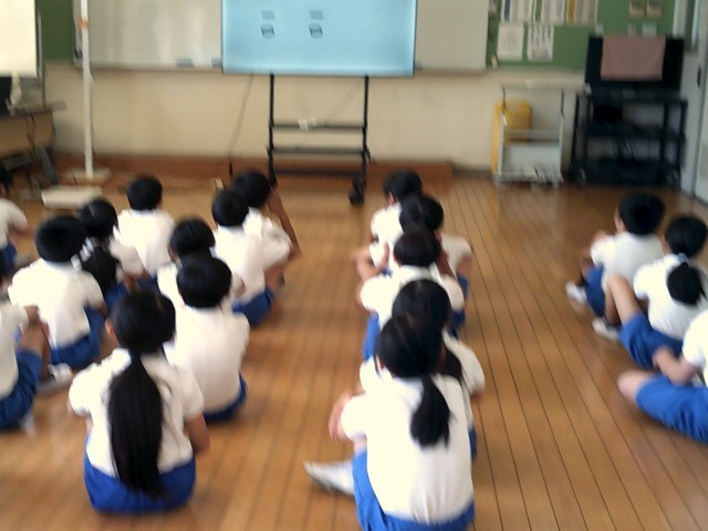 身長、体重測定の後、養護教諭の先生のお話を聞いているところです。