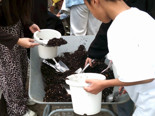 3年生が、ポットから鉢にビオラの苗を植え替えています。