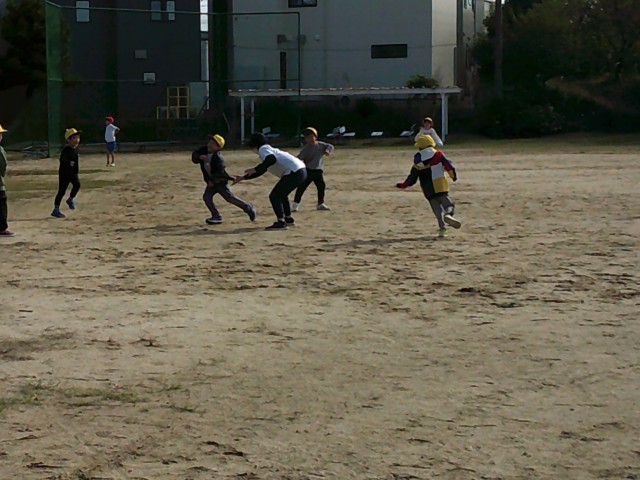 1年生が担任の先生と元気に遊んでいます。