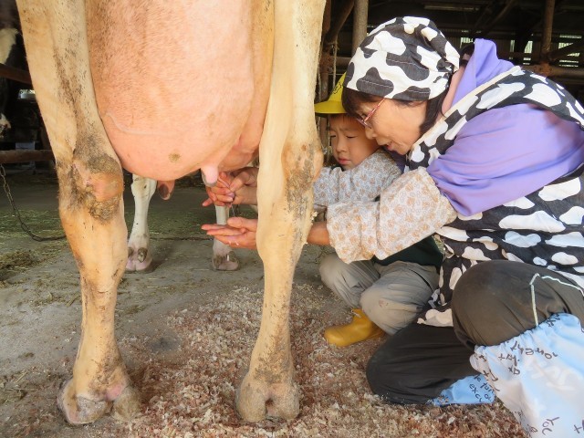 乳しぼり体験では、しぼりたての温かいミルクに触り、