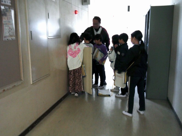 火災警報器、消火器、消火栓、煙感知器などを探して、校内地図に書き込んでいます。
