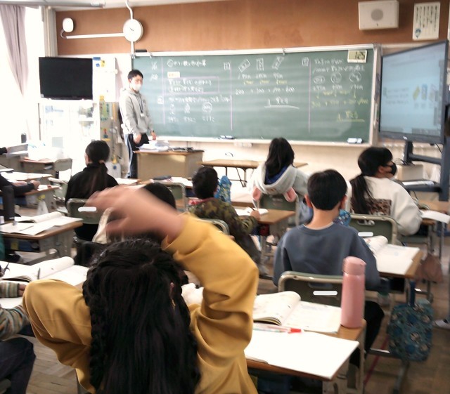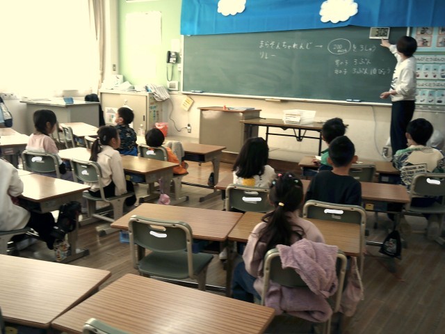 4年生は算数、1年生は初めてのマラソンチャレンジについての説明を聞いていました。