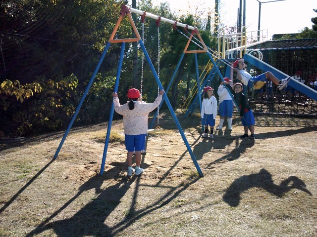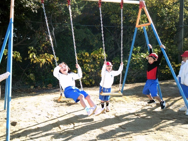 朝放課から大人気のブランコ、鎖が新しくなりさっそく試乗です。