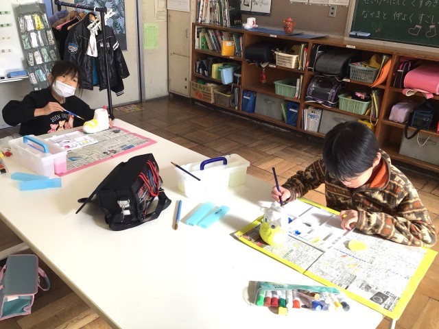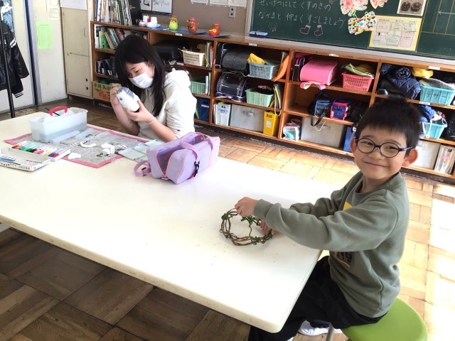 紙粘土でお気に入りの入れ物(貯金箱・鉛筆立て)を作っています。今日は乾いた紙粘土に色を付けました。完成したら作品展に出品します。できあがった子は、冬のリースを作り始めました。