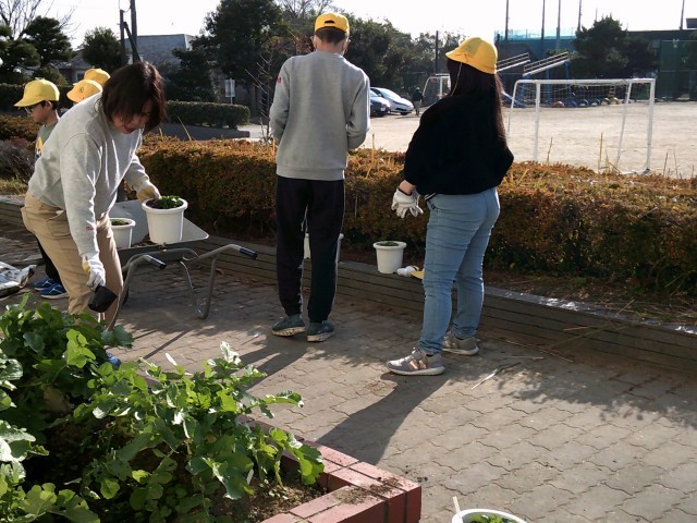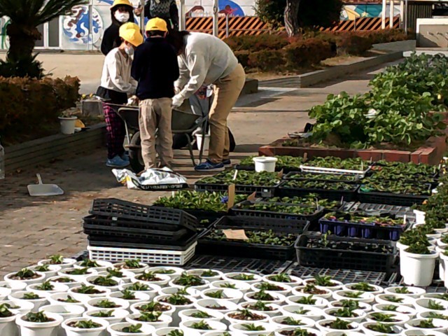風もなく暖かい2時間目、パンジーを鉢に植え替えていました。