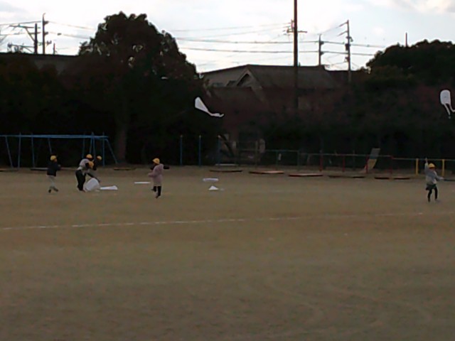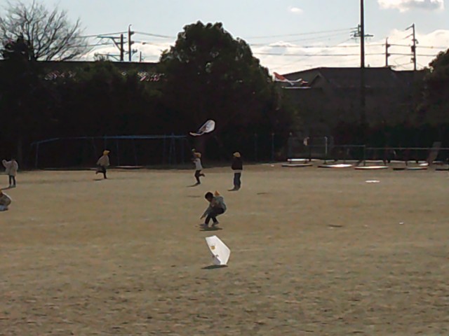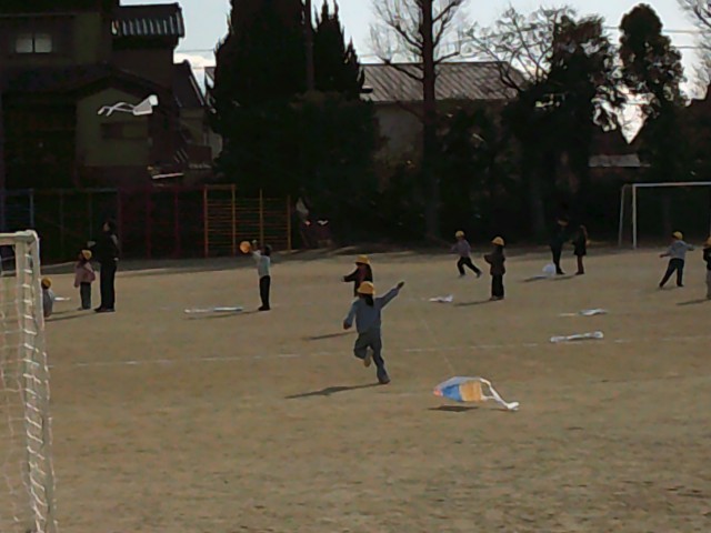 授業参観で絵を描いて作った凧を、4時間目、5時間目に揚げました。