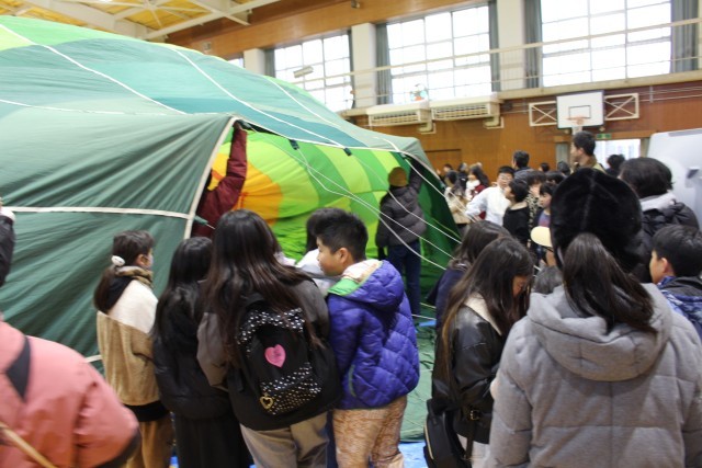 体育館では、実際に膨らませた球皮に触れたり、入ったりすることができました。