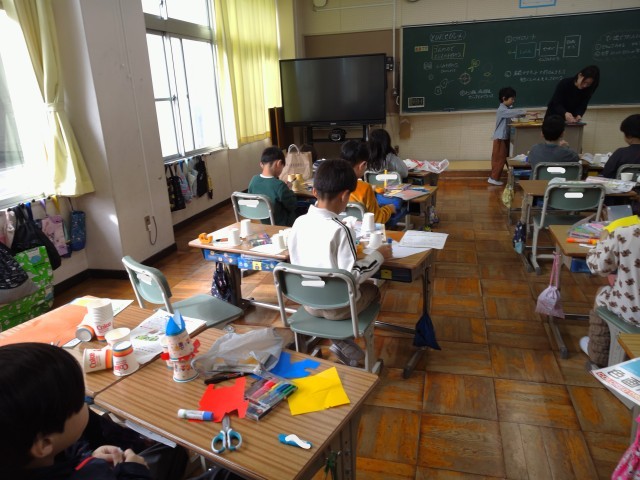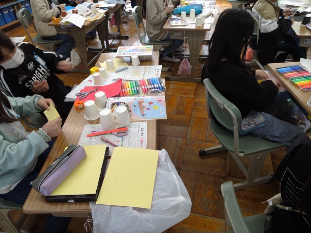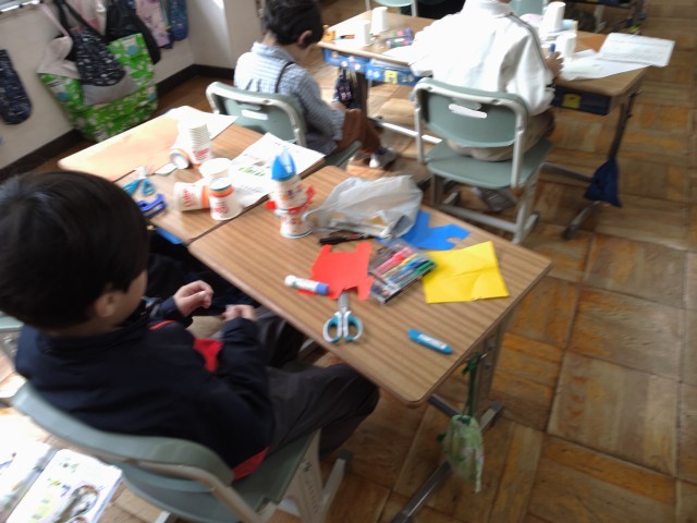 「とびだせ ぴょーん」、紙コップに絵や飾りを付けています。