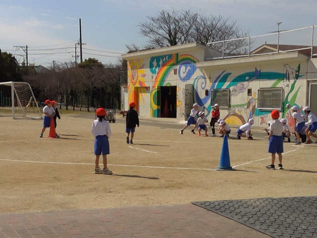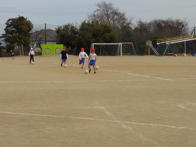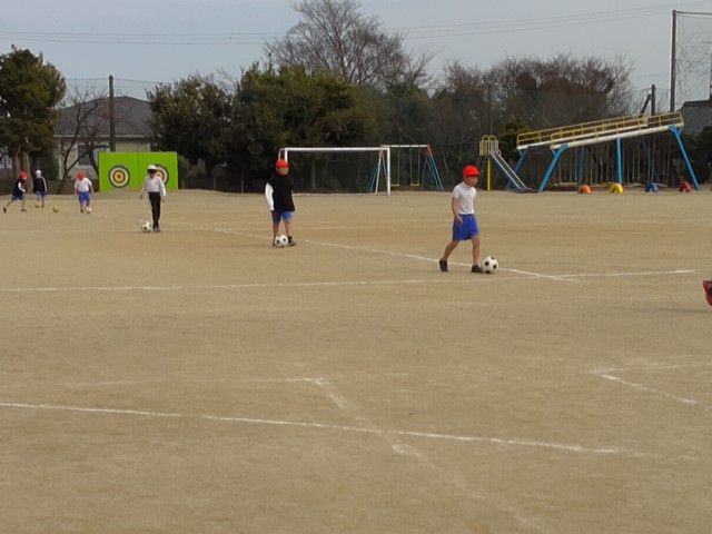 2年生はキックベースの試合、3年生はサッカーのドリブル練習をしています。