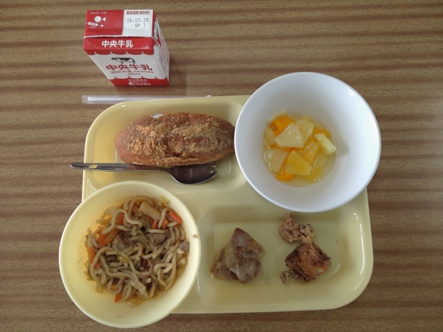 メニューは、牛乳、きなこ揚げパン、焼きそば、鶏肉の唐揚げ、照り焼きチキン、フルーツポンチです。