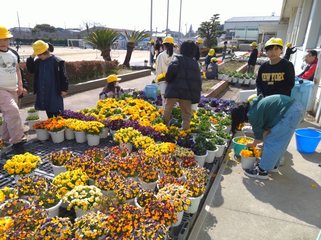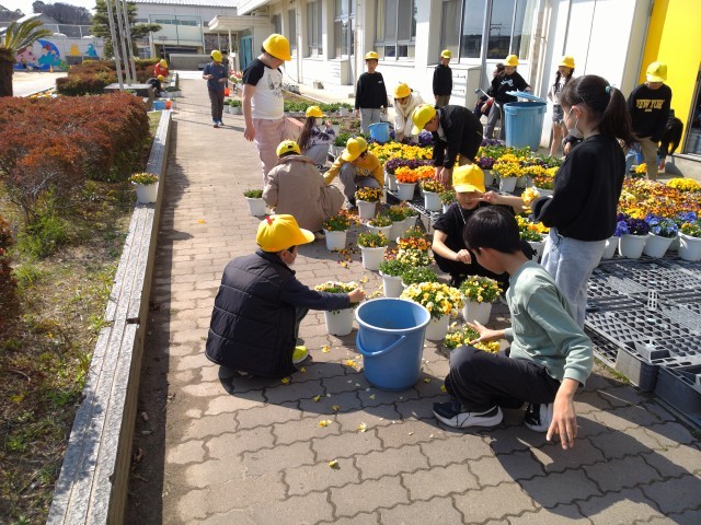 3年生が、卒業式で式場を飾ったパンジーの花を摘んでいました。