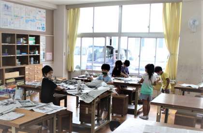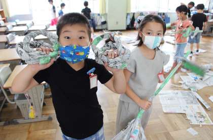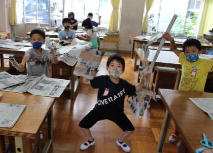2年生の図画工作「しんぶんしと なかよし」で,教室や図工室を使い,新聞紙を用いた作品を幾つも作っていました。(以前,見学した時も感じましたが)広い場所で,子どもたちが伸び伸びと大きな作品を作るようすは,とても豪快ですね。